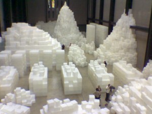 I went to see the press viewing of Rachel Whiteread’s new installation at Tate Modern this morning. It’s about 14000 white plastic boxes moulded from cardboard boxes, glued on top of each other in a series of huge, towering piles.