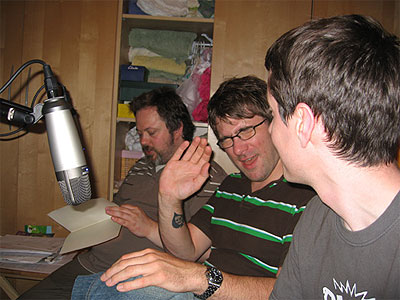 Here’s us recording it last night (that’s (L to R) Jason, Rich and me in the picture). Jason did a great job of editing my more witless comments and generally tightening it all up – and also getting an interview with DJ Nu-Mark of Jurassic 5. And Sam Gilbey (who took the picture) lined up some great music.